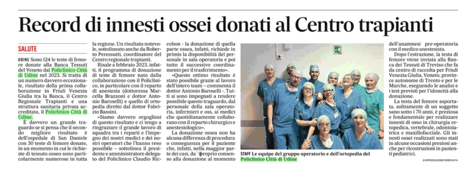 Record di innesti ossei donati al Centro trapianti
